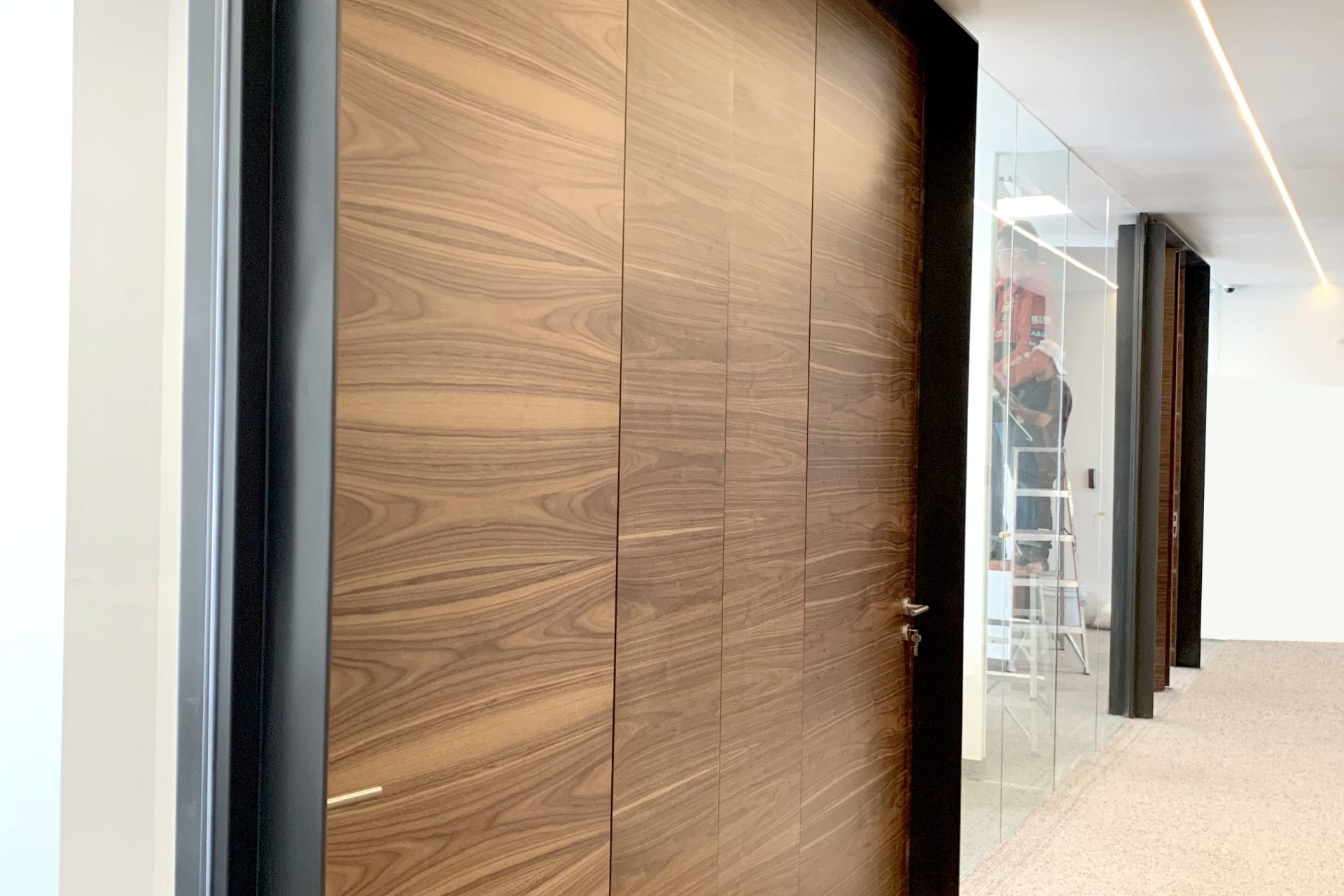 Madera de nogal y placas de acero fueron los materiales visuales que utilizamos como eje creativo, combinados con vidrio y elementos verdes.